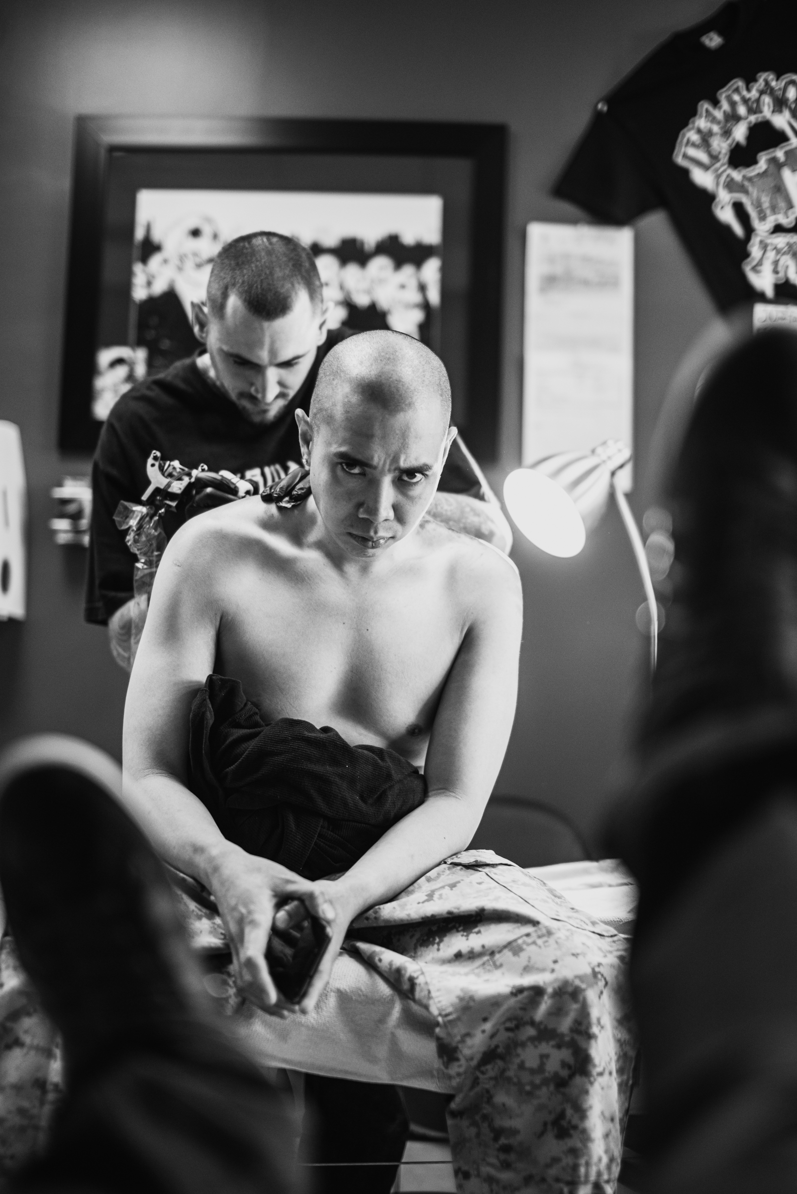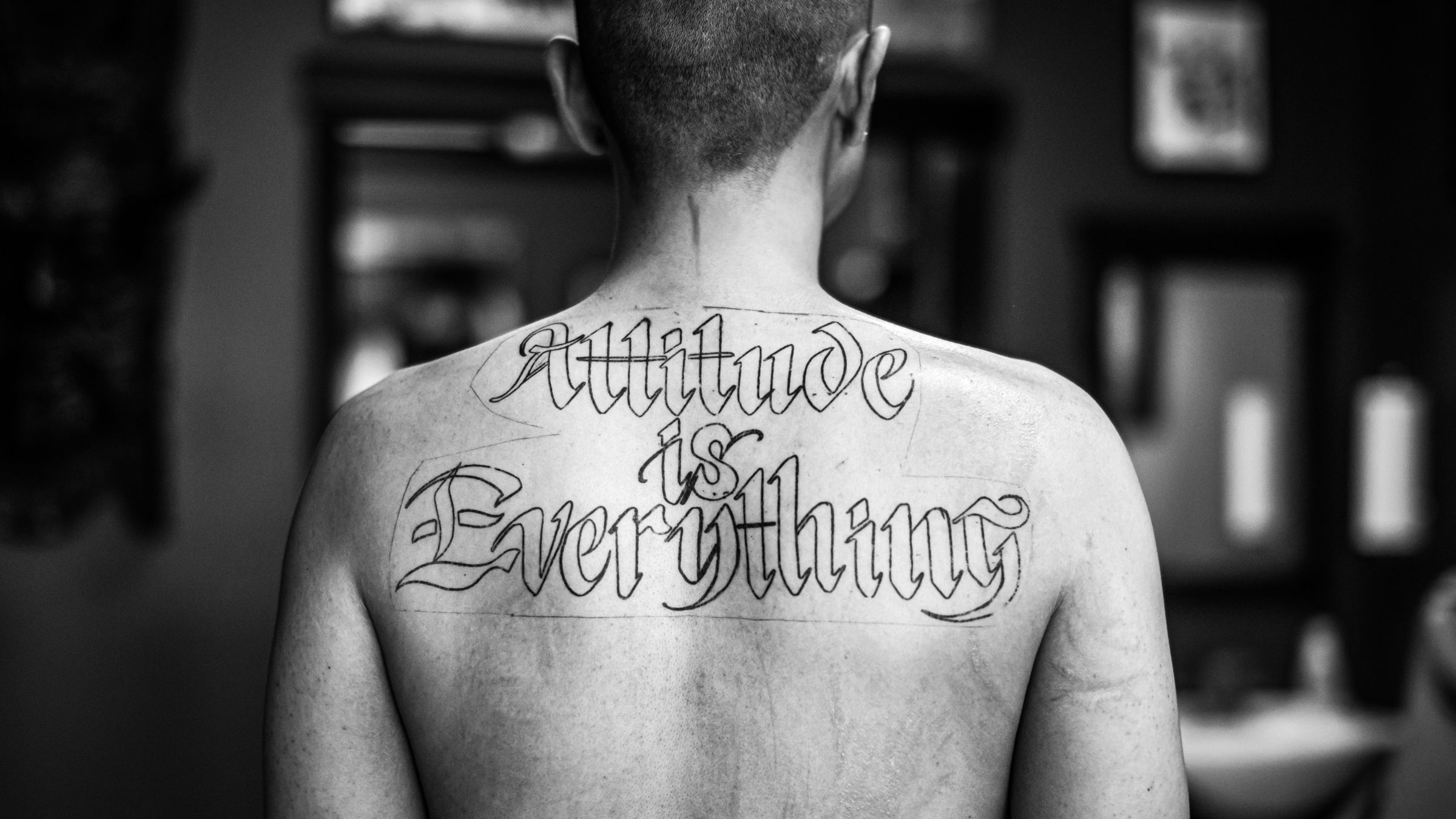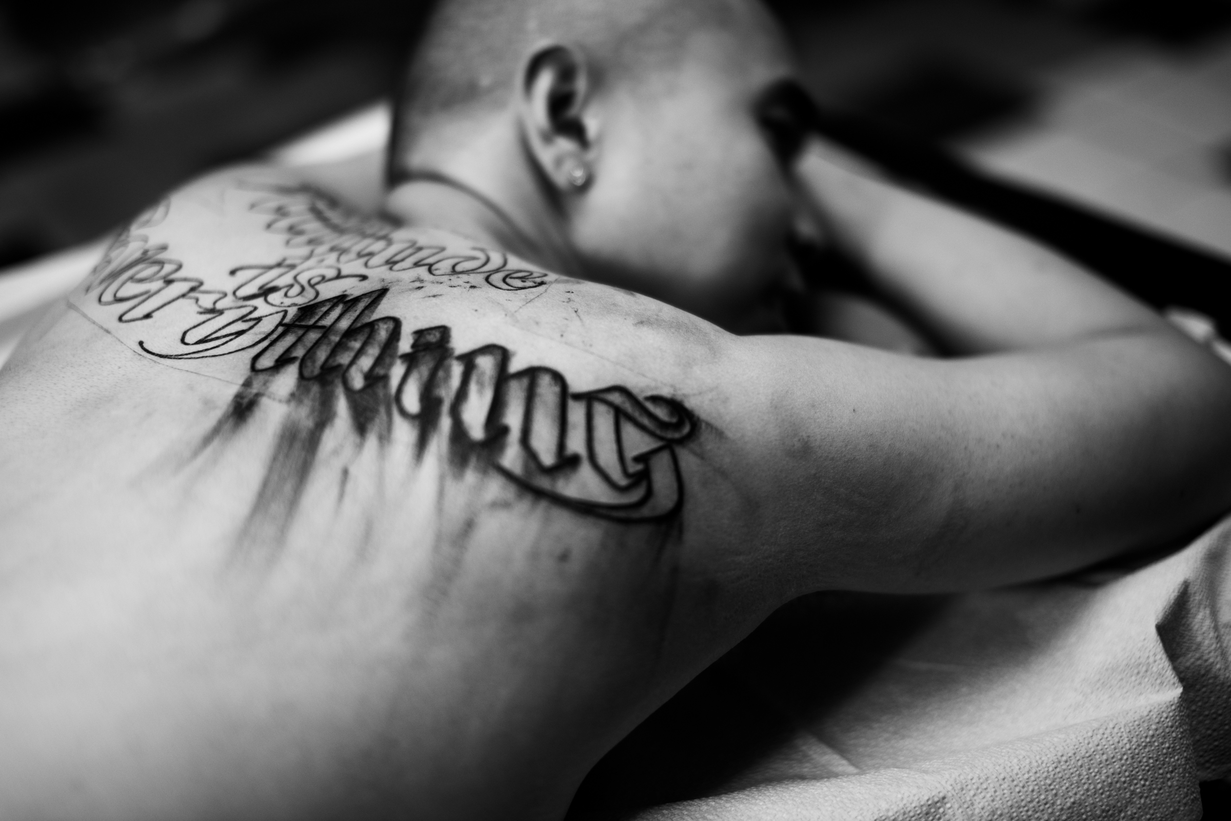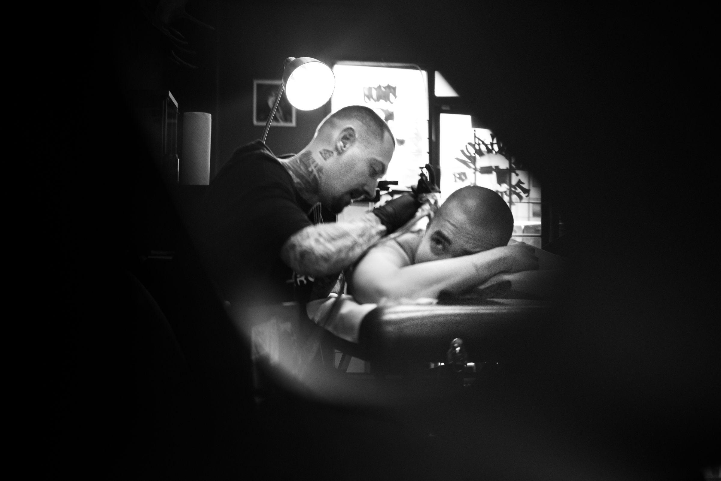 My friend wanted a tattoo across his upper back “Attitude Is Everything” in Roman lettering or something like that. I don’t have a tattoo myself, so walking into that space felt completely unfamiliar. But I brought my camera (Nikon D800) and my curiosity, and that was enough.