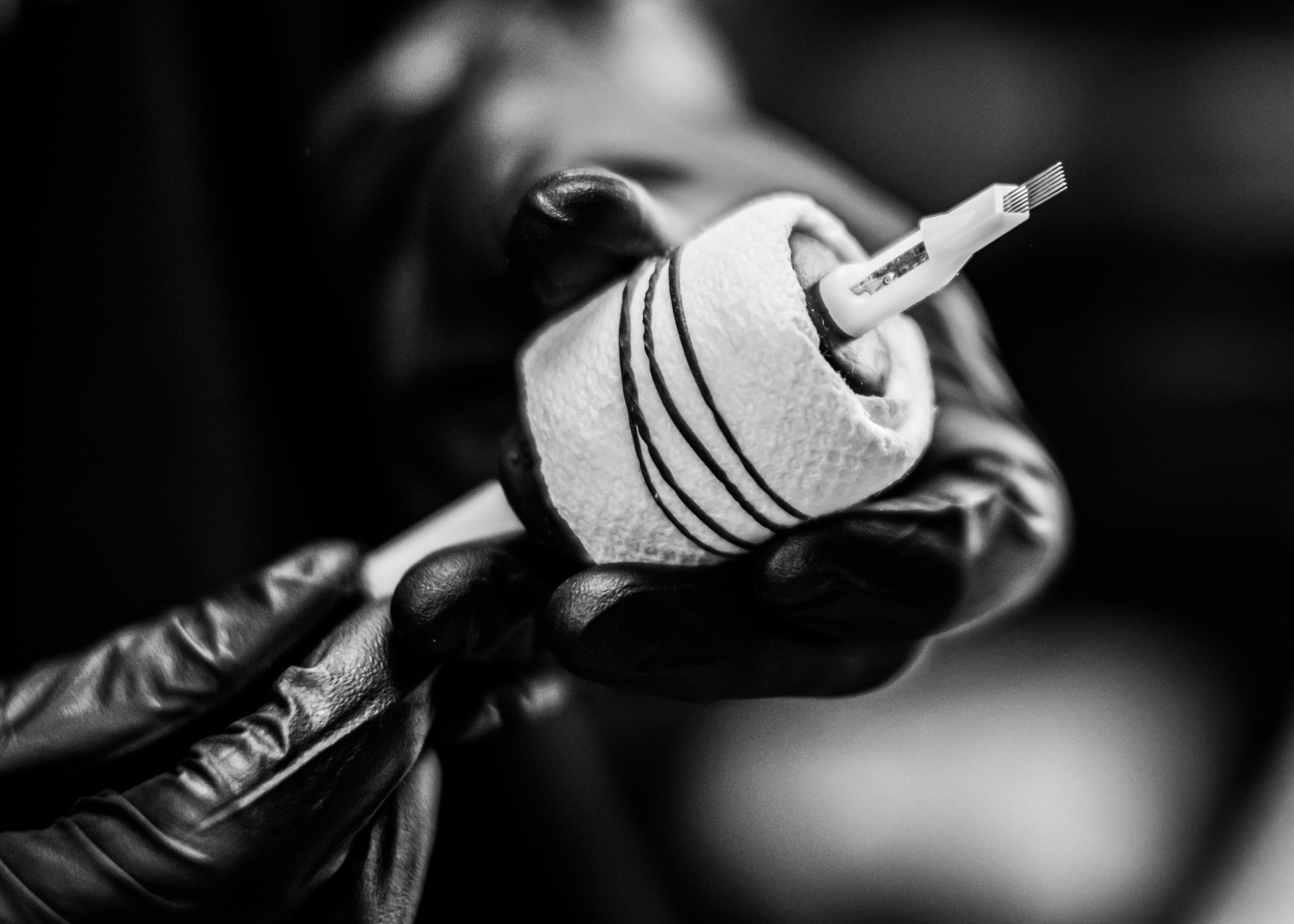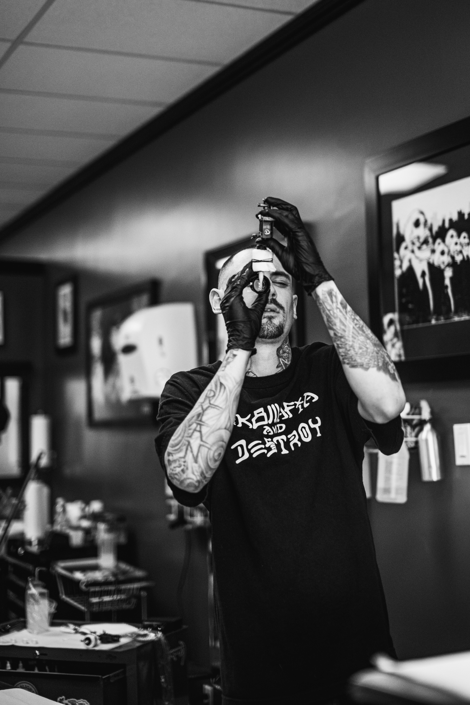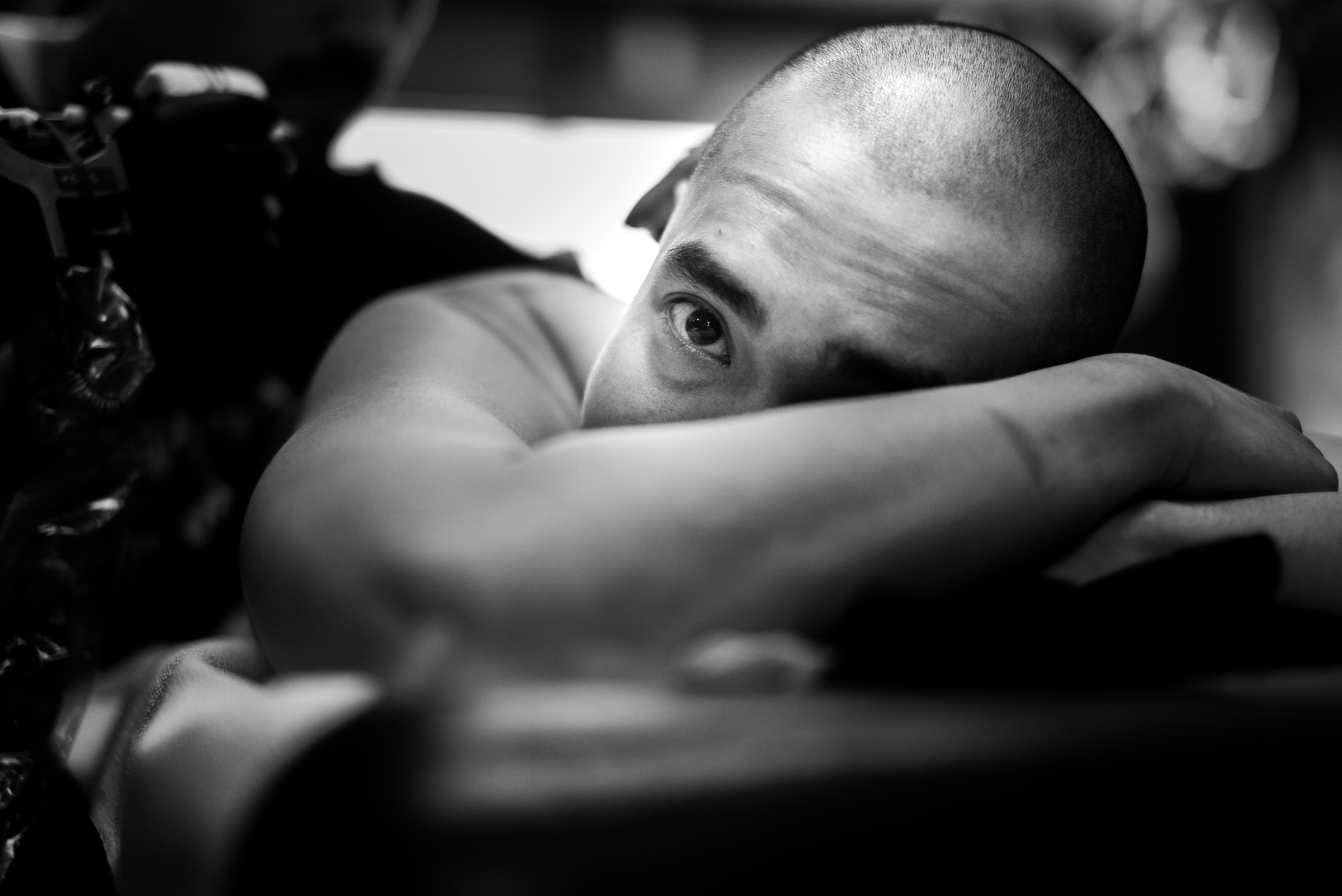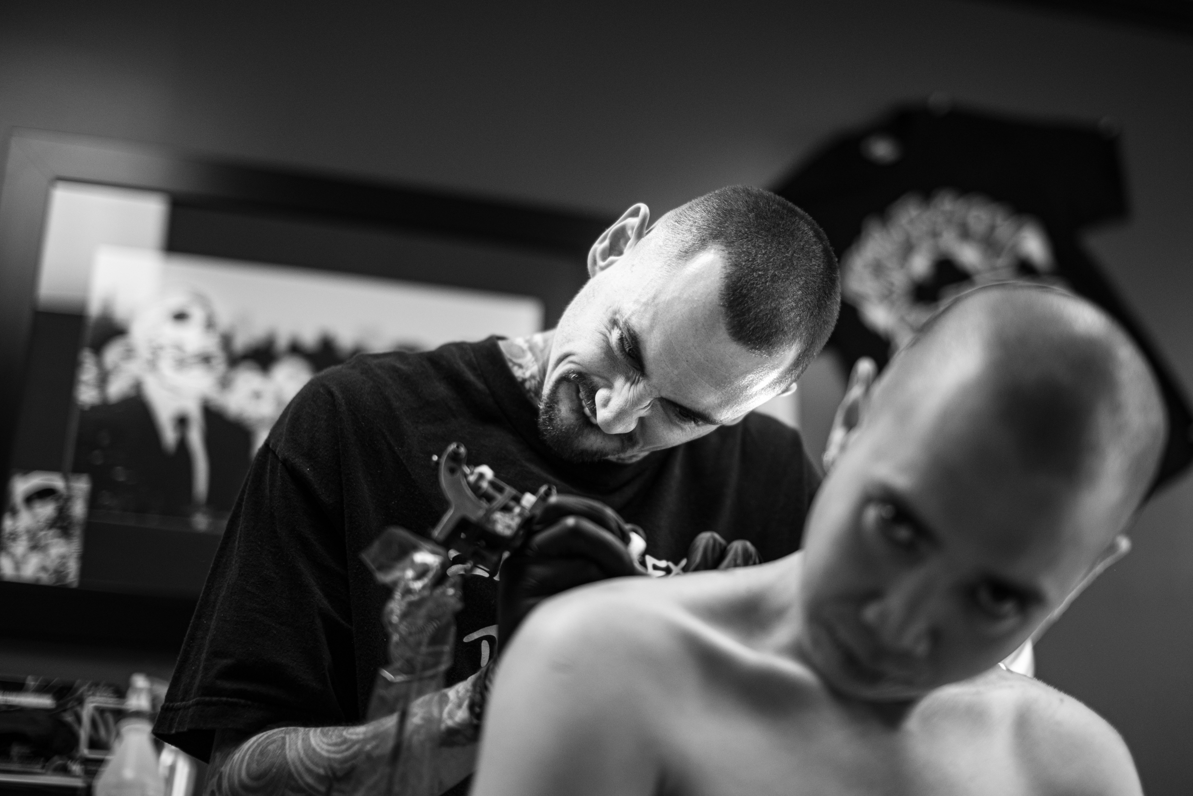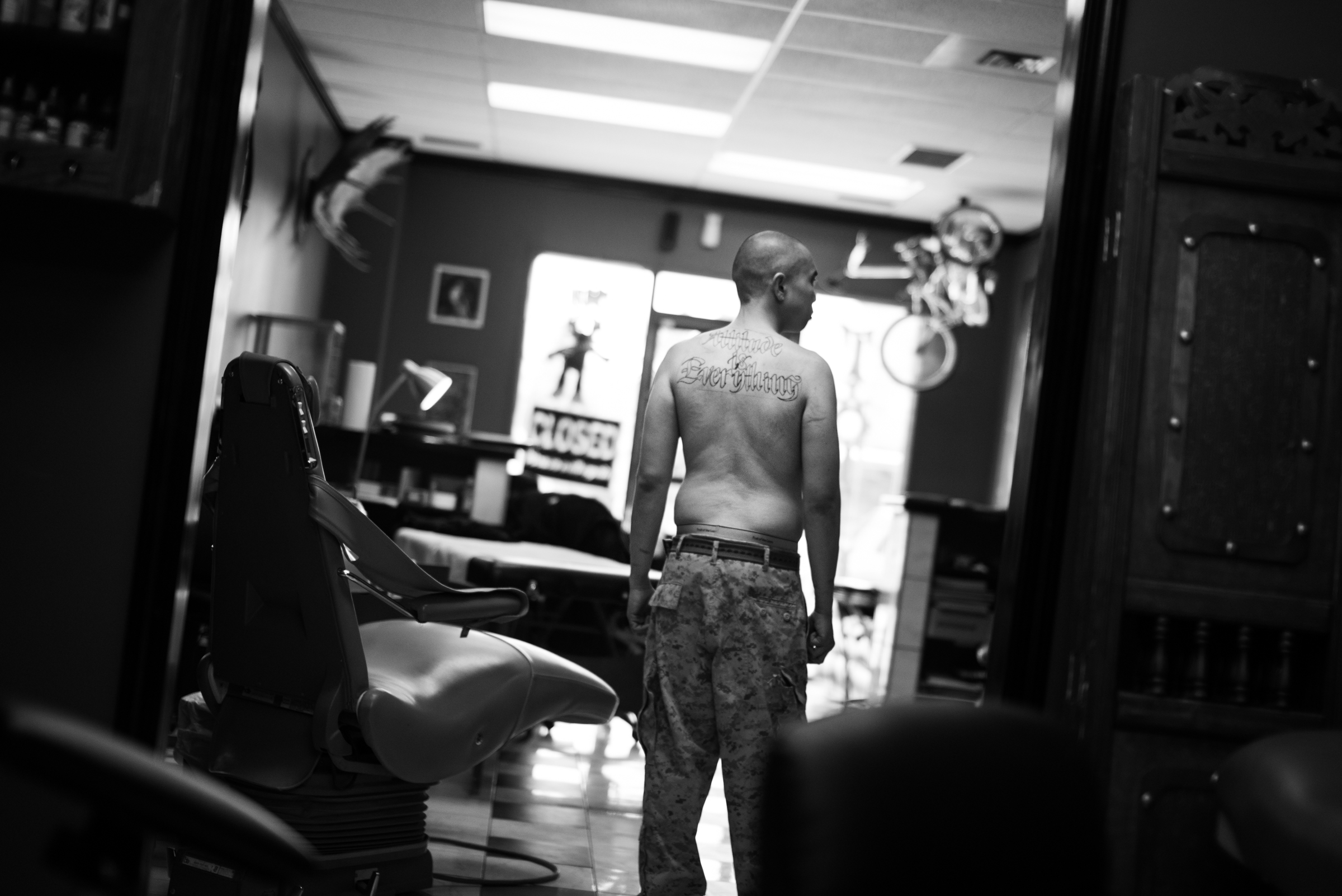 My friend wanted a tattoo across his upper back “Attitude Is Everything” in Roman lettering or something like that. I don’t have a tattoo myself, so walking into that space felt completely unfamiliar. But I brought my camera (Nikon D800) and my curiosity, and that was enough.